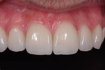 Mellanrum mellan flera framtänder samt trasiga hörn och felaktig lutning på framtänderna. Behandling: Generell blekning samt 6 porslinsfasader.