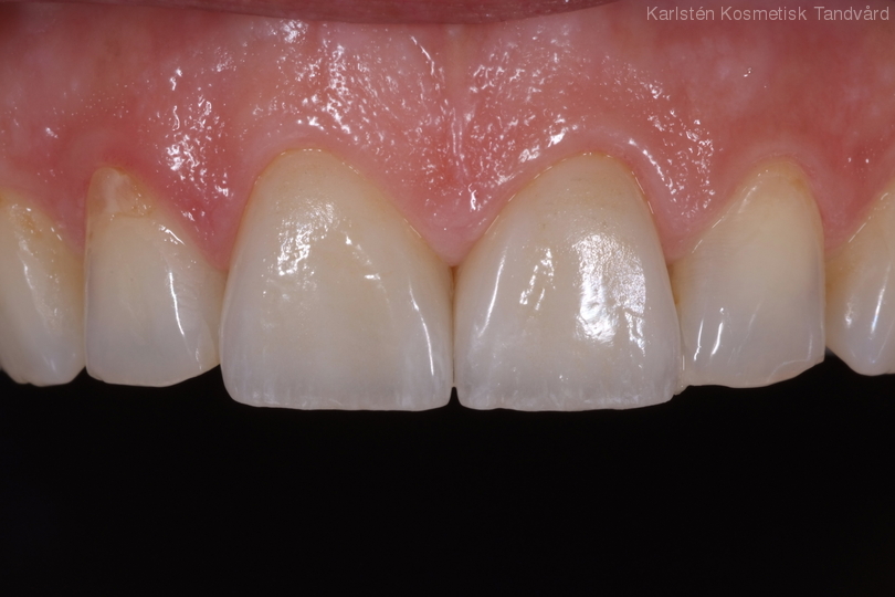 2 framtänder som står bakåttippade. Nötta av tandgnissling. Behandling: Inkorrigering av bettet samt 2 fasader.