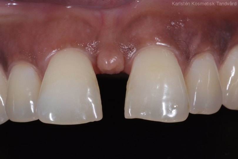 Kvinna som vill ha ett mindre mellanrum mellan framtänderna. Behandling: Generell blekning samt 4 fasader.