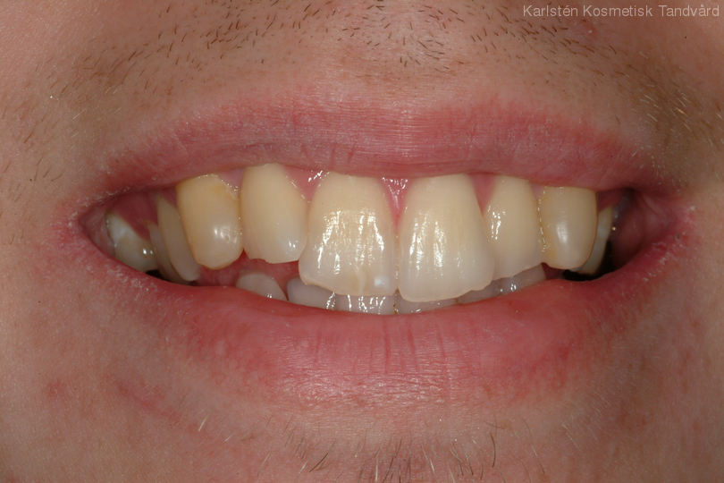 Ojämna, oregelbundna och gula tänder. Behandling: Generell blekning samt 6 fasader.