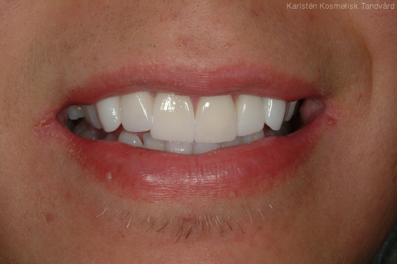 Ojämna, oregelbundna och gula tänder. Behandling: Generell blekning samt 6 fasader.
