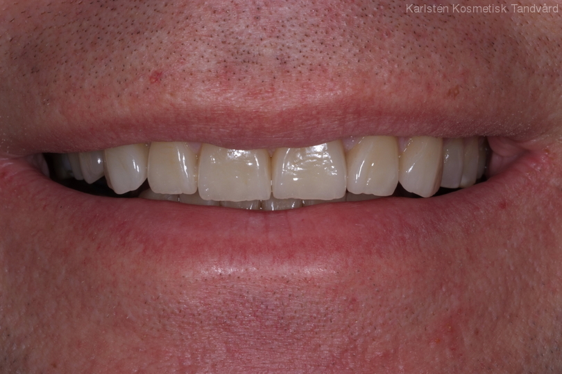 Slitna tänder generellt. Behandling: Blekning samt 8 kronor i överkäken samt 6 kronor i underkäken.