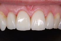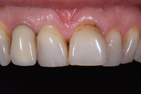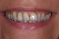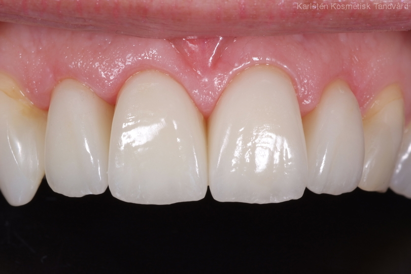 Missfärgade framtänder som är olika stora och har olika färg. Behandling: Generell blekning, laserkonturering av tandköttet, 2 compositefyllningar på hörntänderna samt 4 kronor.