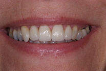 Missfärgade framtänder som är olika stora och har olika färg. Behandling: Generell blekning, laserkonturering av tandköttet, 2 compositefyllningar på hörntänderna samt 4 kronor.
