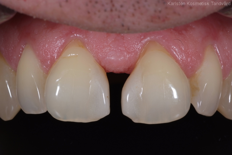 Stort mellanrum mellan framtänderna, tidigare lagat med composite. Behandling: Generell blekning, 2 fasader och 2 kronor.
