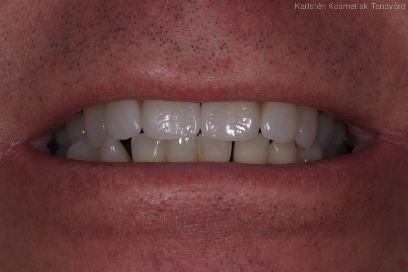 Stort mellanrum mellan framtänderna, tidigare lagat med composite. Behandling: Generell blekning, 2 fasader och 2 kronor.