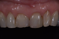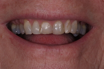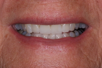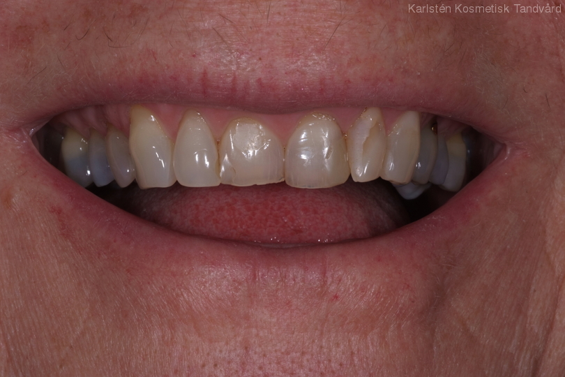 Kvinna med missfärgade och lagade framtänder. Vill se hel och fin ut. Behandling: Generell blekning, laserkonturering av tandköttet samt 4 kronor.