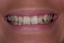 18-årig flicka som är missnöjd med sina framtänder. Behandling: Generell blekning, laserkonturering på 4 framtänder, 4 fasader samt 1 compositefyllning på hörntand.