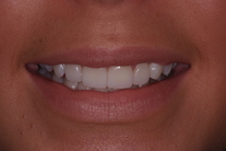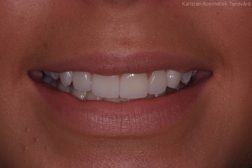 18-årig flicka som är missnöjd med sina framtänder. Behandling: Generell blekning, laserkonturering på 4 framtänder, 4 fasader samt 1 compositefyllning på hörntand.