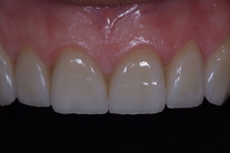 Slitna framtänder och muskelspänningar i käkarna. Behandling med generell blekning, 5 kronor och 6 fasader i överkäken.