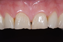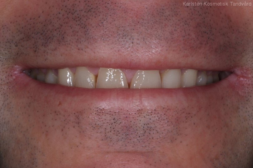 Slitna framtänder och muskelspänningar i käkarna. Behandling med generell blekning, 5 kronor och 6 fasader i överkäken.