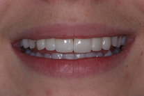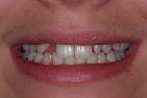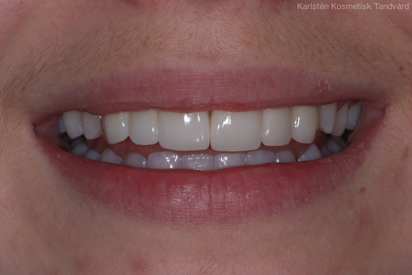 19-årig kvinna som saknar en framtand samt har en missformad tapptand. Behandling: Generell blekning, 3 fasader och bro med 3 tänder.
