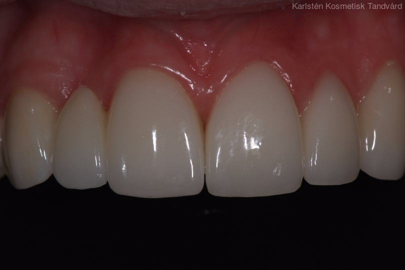 19-årig kvinna som saknar en framtand samt har en missformad tapptand. Behandling: Generell blekning, 3 fasader och bro med 3 tänder.