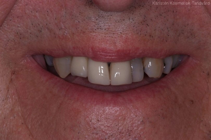 Man med missfärgade och trångställda framtänder. Behandling: Generell blekning samt 4 kronor.