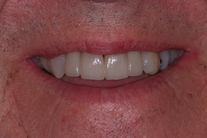 Man med missfärgade och trångställda framtänder. Behandling: Generell blekning samt 4 kronor.