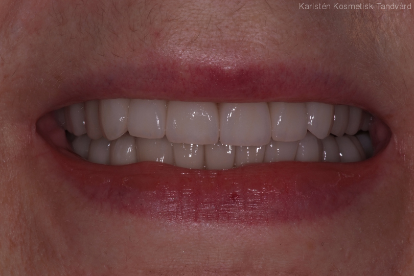 Missfärgade och skadade tänder samt ett kollapsat bett. Behandling med 22 porslinskronor samt en bro.