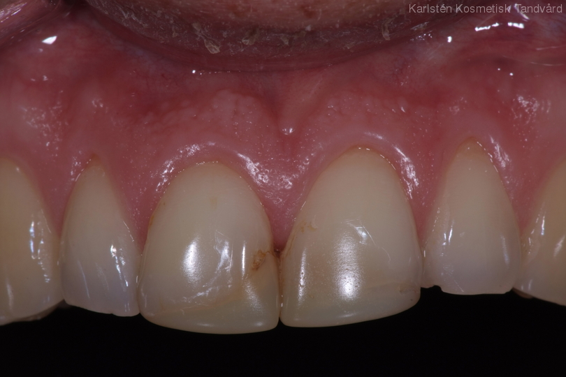 3 framtänder skadade för ett antal år sedan. Då lagade med compositefyllningar. Behandling: Generell blekning, 1 krona och 2 fasader.