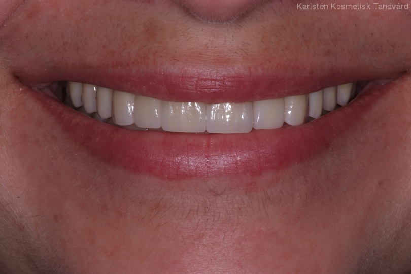 Glest mellan framtänderna och gulnade tänder. Behandling: 13 kronor, 8 fasader och 2 broar med 7 tänder i helkeramik.