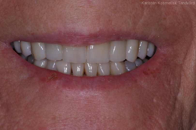Diverse tänder med varierande färg. Bettfunktionsfel med många trasiga tänder. Behandling: Blekning i underkäken samt 16 kronor för att återskapa ett stabilt bett.