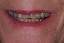 Diverse tänder med varierande färg. Bettfunktionsfel med många trasiga tänder. Behandling: Blekning i underkäken samt 16 kronor för att återskapa ett stabilt bett.