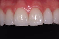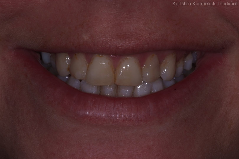 Ung kvinna med missfärgade compositefasader. Behandling: Generell blekning, 2 fasader samt 6 kronor i överkäken.