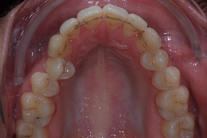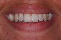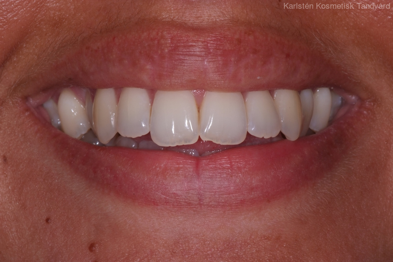 Ung kvinna som tidigare haft tandreglering. Upplever inte att tänderna står i en fin tandbåge. 11 månaders behandling med genomskinliga Invisalignskenor resulterade i ett fint leende.