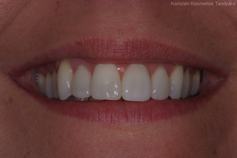 30-årig kvinna med oregelbundna tänder. Behandlingen består av 11 månaders tandreglering med genomskinliga Invisalignskenor, generell blekning samt 3 porslinsfasader.