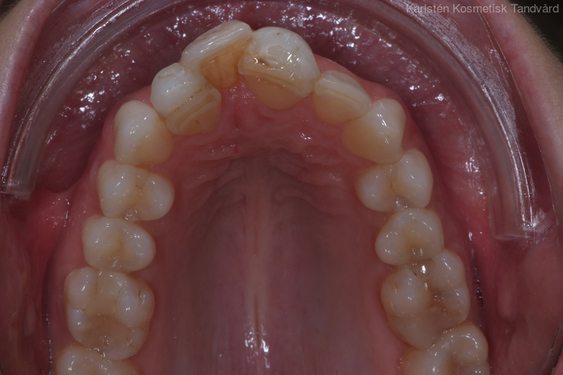 30-årig kvinna med oregelbundna tänder. Behandlingen består av 11 månaders tandreglering med genomskinliga Invisalignskenor, generell blekning samt 3 porslinsfasader.
