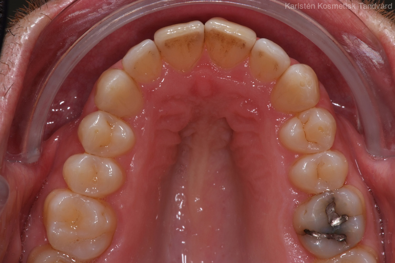 35-årig man med smal och trångställd tandbåge. Vill ha ett jämnt leende. Behandling bestod av knappt 9 månader med genomskinliga Invisalignskenor.