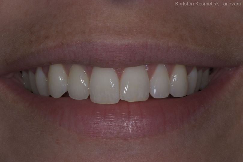 30-årig kvinna med frakturerad framtand med infektion som måste tas bort. Behandlingen bestod av generell blekning, implantat med ben- och bindvävsuppbyggnad samt en implantatkrona