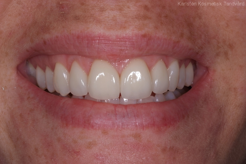 Stort mellanrum mellan framtänderna, ca 4 mm. Behandling: Generell blekning samt 4 fasader.