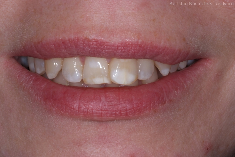 Önskemål om jämnare tandrad. Behandling: Generell blekning, laserkonturering av tandköttet samt 4 fasader.