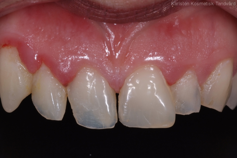 Kraftigt nergnisslade tänder. Behandling: Generell blekning, laserkonturering samt 21 porslinständer.