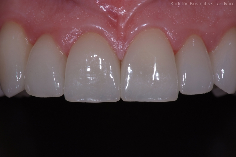 Kraftigt nergnisslade tänder. Behandling: Generell blekning, laserkonturering samt 21 porslinständer.