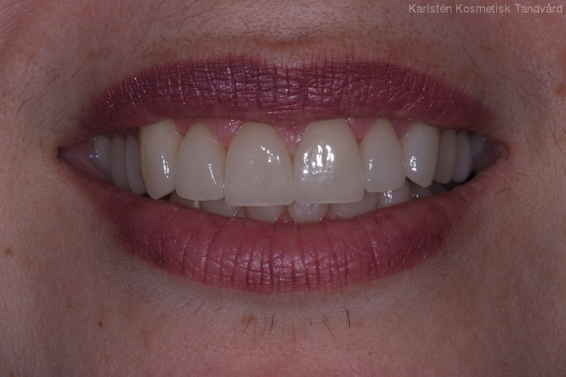 Kraftigt nergnisslade tänder. Behandling: Generell blekning, laserkonturering samt 21 porslinständer.