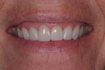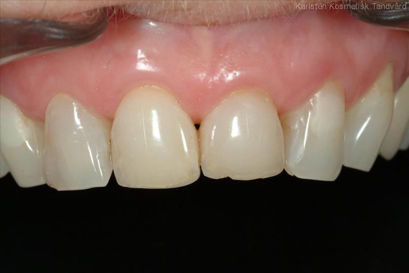 Assymetriska framtänder. Önskemål fanns om mer symmetri. Behandling: Generell blekning samt 5 fasader och 1 krona