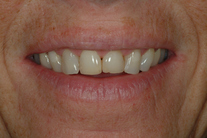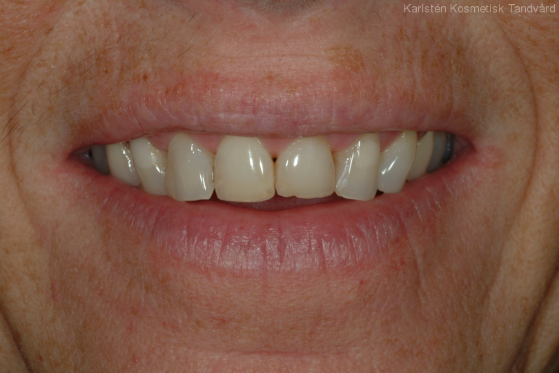 Assymetriska framtänder. Önskemål fanns om mer symmetri. Behandling: Generell blekning samt 5 fasader och 1 krona