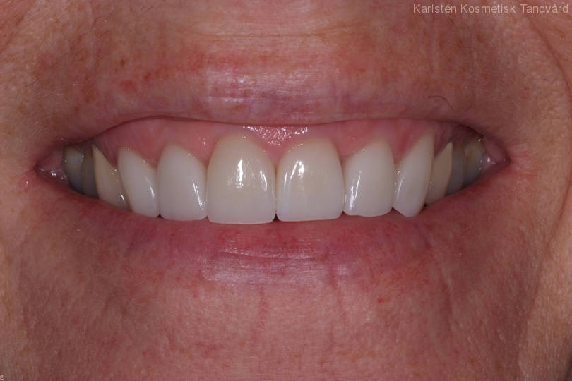 Assymetriska framtänder. Önskemål fanns om mer symmetri. Behandling: Generell blekning samt 5 fasader och 1 krona