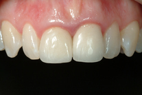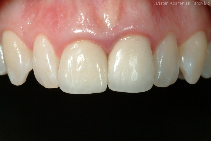 Ojämna och assymetriska rotfyllda framtänder. Behandling: Generell blekning, höjning av tandköttet, 2 fasader och 2 kronor.