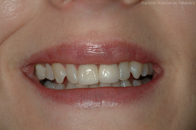 Ojämna och assymetriska rotfyllda framtänder. Behandling: Generell blekning, höjning av tandköttet, 2 fasader och 2 kronor.
