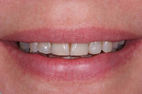 Spricka i framtandsrot gjorde det nödvändigt att ta bort tanden. Behandling: Ersattes med TandNu, dvs med ett implantat där tanden kan användas direkt samt generell blekning och 3 framtandsfyllningar.