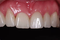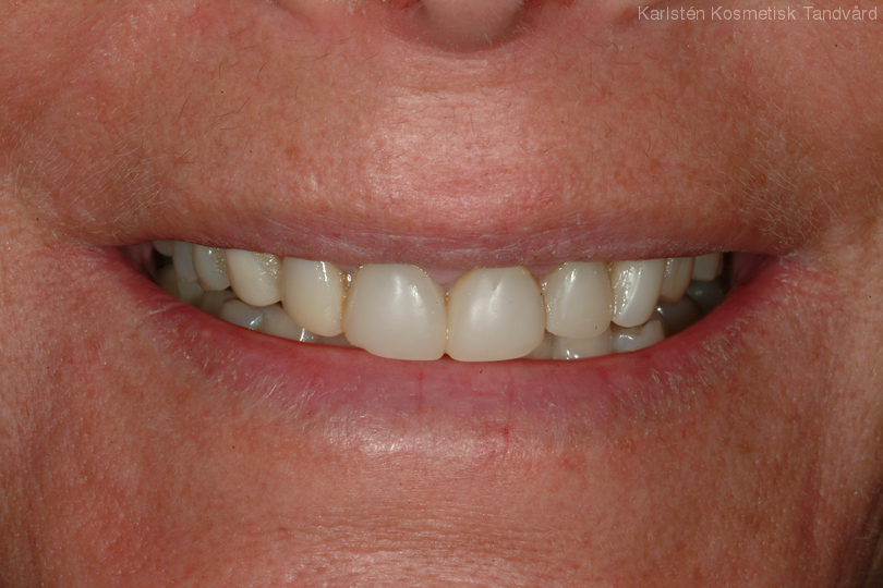 6 gamla plastfasader med inflammation i tandköttet pga dåliga skarvar. Behandling: Generell blekning samt 6 porslinsfasader.