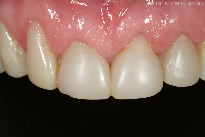 6 gamla plastfasader med inflammation i tandköttet pga dåliga skarvar. Behandling: Generell blekning samt 6 porslinsfasader.