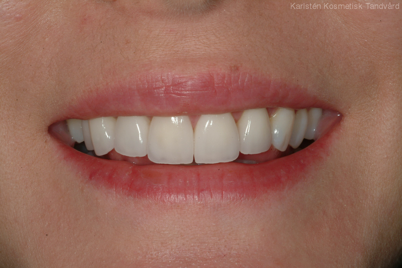 Nötta och slitna tänder med lite felställning. Behandling: Generell blekning samt 5 fasader i överkäken.