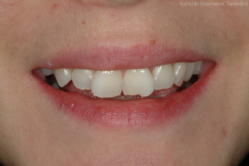Nötta och slitna tänder med lite felställning. Behandling: Generell blekning samt 5 fasader i överkäken.