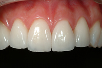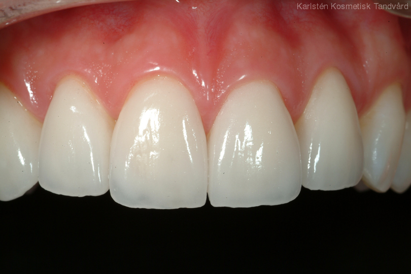 Nötta och slitna tänder med lite felställning. Behandling: Generell blekning samt 5 fasader i överkäken.