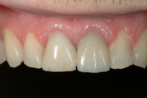 2 framtänder i överkäken med dåliga fasader och bakterieläckage på baksidan. Behandling: Generell blekning samt 2 porslinskronor.