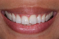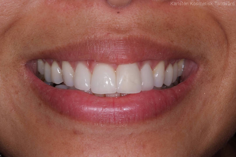 Framåttippad framtand i överkäken. I övrigt fina tänder. Behandling: 4 fasader.