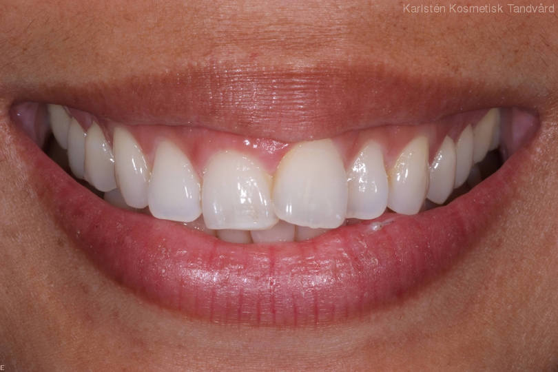 Framåttippad framtand i överkäken. I övrigt fina tänder. Behandling: 4 fasader.