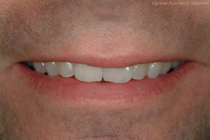 1 framtand i överkäken måste tas bort pga spricka i roten. Behandling: Generell blekning, 1 implantat med 1 krona samt 1 fasad på den andra framtanden för att erhålla en jämnare tandrad.
